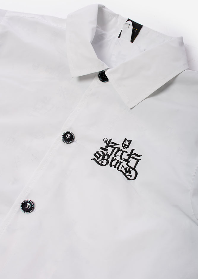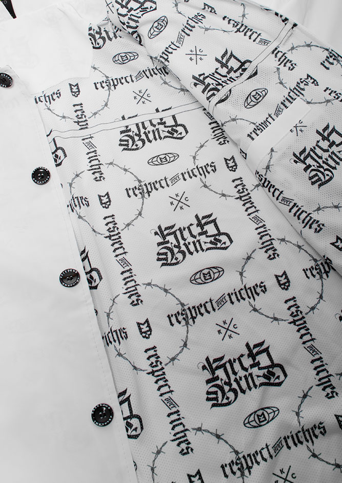 Confecționata dintr-un material de tip Fâș alb cu membrana impermeabila, produsul a fost personalizat prin aplicarea de broderii in partea stânga superioara si pe guler, cele 2 buzunare laterale iar interiorul a fost sublimat cu un pattern stil graffiti a denumirii brandului + logo-ul skull Krck Brnd, de culoarea neagra.
