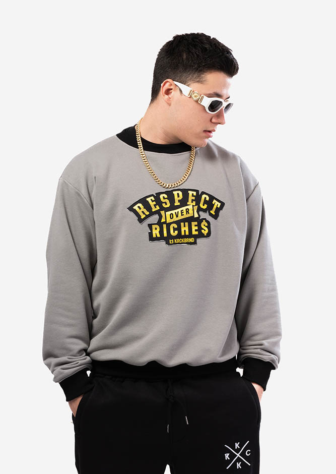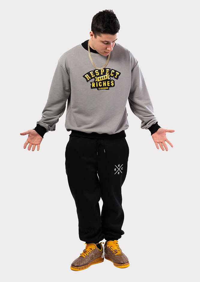 Have a go at this wonderful piece which completes our grey selection of comfy items. Its golden design sports a bold ”RESPECT OVER RICHES” lettering and a powerful message one shouldn`t easily forget. It was created for indoor sessions but is an absolutely great fit for exploring the great outdoors as well. The grey color is so versatile it goes with mostly all your wardrobe. Extremely few of these premium items are made so don`t think too much before adding this to your cart!